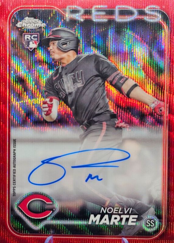 Auctions Ending Soon for Noelvi Marte 2024 Topps Chrome #RA-NM Rookie Autographs - Red Wave Refractor /5 RAW