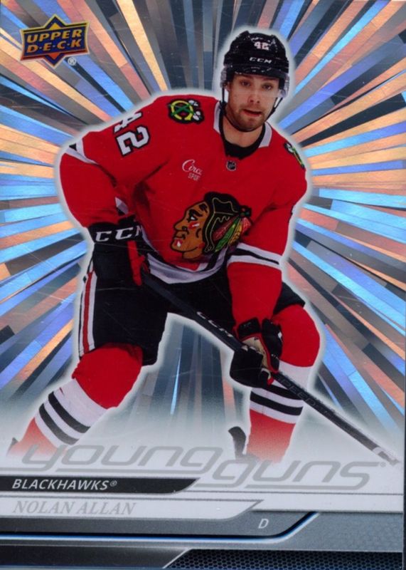 This card is 1 of 8 Nolan Allan's card variations in the 2024 Upper Deck set being tracked by Sports Card Investor, including Young Guns Base, Young Guns - Clear Cut, Young Guns - Deluxe /250, Young Guns - UD Exclusives /100, and Young Guns - Outburst Red /25.
