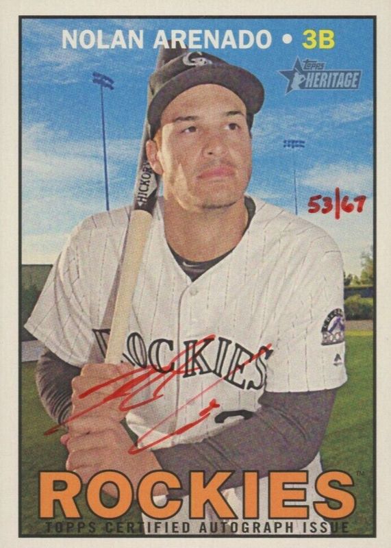 This card is 1 of 2 Nolan Arenado's card variations in the 2016 Topps Heritage High Number set being tracked by Sports Card Investor, including Real One Autographs.