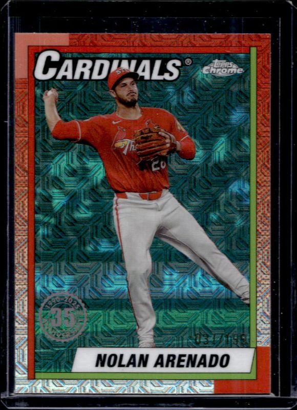 The Nolan Arenado 2025 Topps #T90C-48 1990 Baseball Chrome Silver Pack - Aqua Refractor /199 card is 1 of 256 Nolan Arenado's card variations in the 2025 Topps set being tracked by Sports Card Investor, including Base, Aqua Holo Foil, Diamante Foil, Holo Foil, and Pink Diamante Foil.
