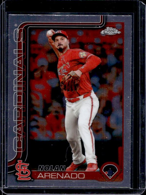 The Nolan Arenado 2025 Topps Chrome #14 Base card is 1 of 81 Nolan Arenado's card variations in the 2025 Topps Chrome set being tracked by Sports Card Investor, including Geometric Refractor, Image Variation, Lightboard Logo Variation, Negative Refractor, and Prism Refractor.