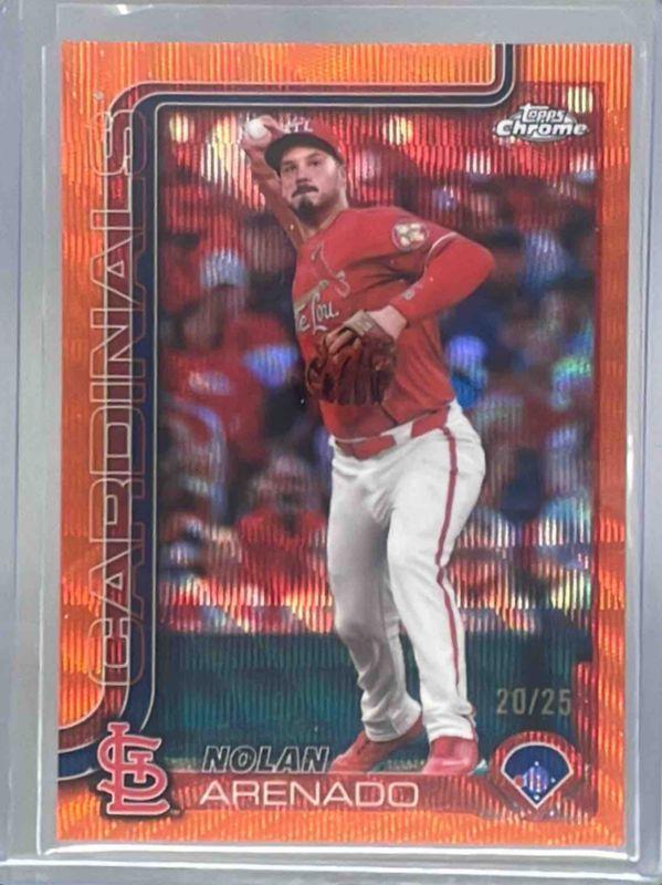 The Nolan Arenado 2025 Topps Chrome #14 Orange Wave Refractor /25 card is 1 of 81 Nolan Arenado's card variations in the 2025 Topps Chrome set being tracked by Sports Card Investor, including Base, Geometric Refractor, Image Variation, Lightboard Logo Variation, and Negative Refractor.