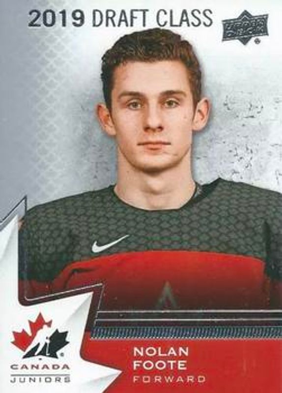 The Nolan Foote 2020 Upper Deck Team Canada Juniors #97 Base Rookie card is 1 of 33 Nolan Foote's card variations in the 2020 Upper Deck Team Canada Juniors set being tracked by Sports Card Investor, including #111 Base, #43 Base, #97 Exclusives /165, #43 Exclusives /165, and #111 Exclusives /165.