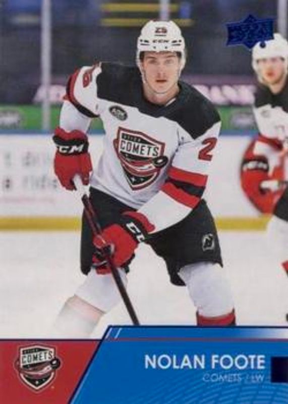 The Nolan Foote 2021 Upper Deck AHL #14 Blue card is 1 of 9 Nolan Foote's card variations in the 2021 Upper Deck AHL set being tracked by Sports Card Investor, including Base, Exclusives /100, High Gloss /10, Autographs, and Printing Plates - Black /1.