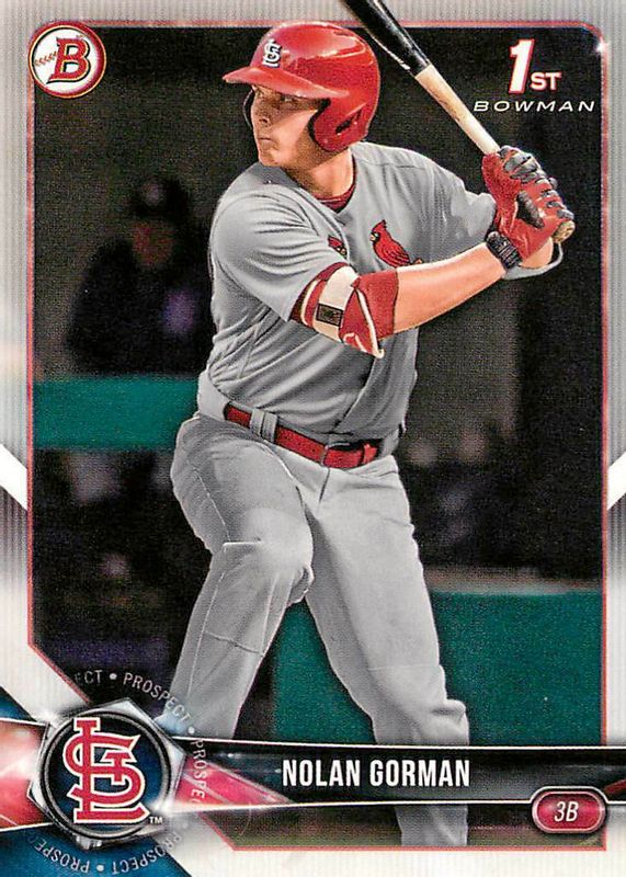 This card is 1 of 18 Nolan Gorman's card variations in the 2018 Bowman Draft set being tracked by Sports Card Investor, including Chrome (1st), Chrome - Refractor (1st), Chrome DP Auto (1st), Chrome DP Auto - Refractor /499 (1st), and Chrome DP Auto - Purple Refractor /250 (1st).