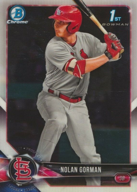 The Nolan Gorman 2018 Bowman Draft #BDC-117 Chrome (1st) card in Raw condition has moved down -$0.04 (-2.0%) in the last 30 days and was last sold for $1.95 .