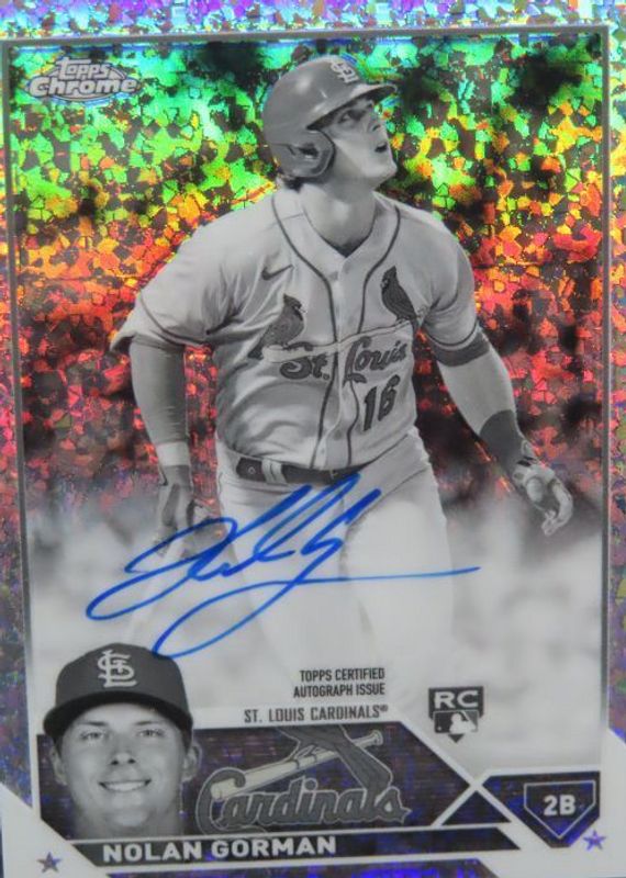 Auctions Ending Soon for Nolan Gorman 2023 Topps Chrome #RA-NGO Rookie Autographs - Black & White Mini-Diamond Refractor RAW