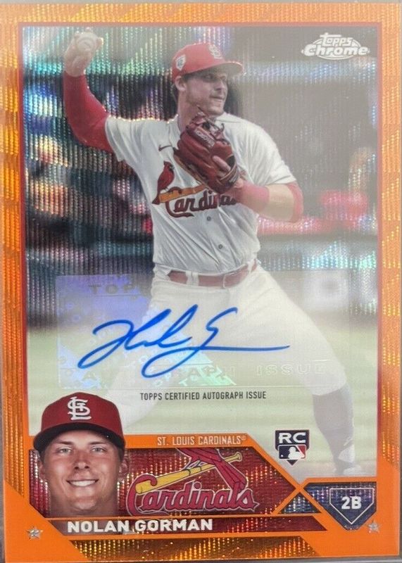 Auctions Ending Soon for Nolan Gorman 2023 Topps Chrome Update #AC-NG Autographs - Orange Refractor /25 Rookie RAW