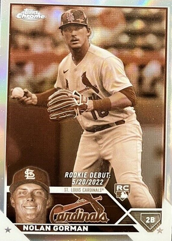 This card is 1 of 41 Nolan Gorman's card variations in the 2023 Topps Chrome Update set being tracked by Sports Card Investor, including Rookie Debut, Rookie Debut - Negative Refractor, Rookie Debut - Pink Refractor, Rookie Debut - Prism Refractor, and Rookie Debut - Refractor.