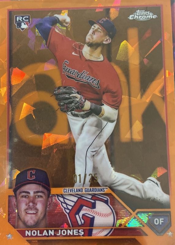 The Nolan Jones 2023 Topps Chrome Sapphire Edition #129 Orange /25 Rookie card in Raw condition has not changed in price in the last 30 days and was last sold for $25.00 .