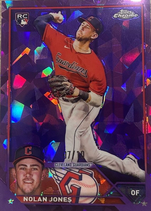 The Nolan Jones 2023 Topps Chrome Sapphire Edition #129 Purple /10 Rookie card in Raw condition has not changed in price in the last 30 days and was last sold for $76.55 .
