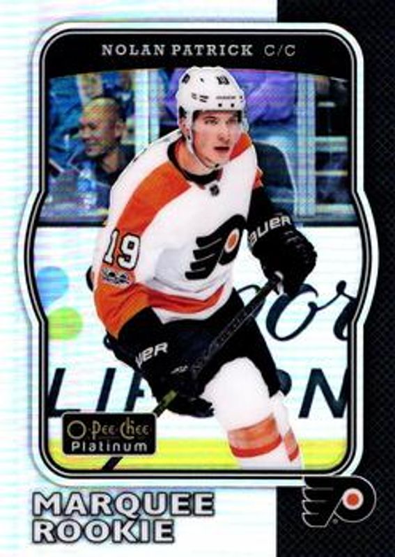 The Nolan Patrick 2017 O-Pee-Chee Platinum #R-70 Retro Rainbow Rookie card is 1 of 24 Nolan Patrick's card variations in the 2017 O-Pee-Chee Platinum set being tracked by Sports Card Investor, including Base, Rainbow, Violet Pixels, Red Prism /199, and Royal Blue Cubes /99.