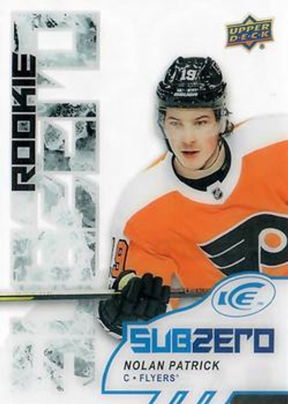 The Nolan Patrick 2017 Upper Deck Ice #V5 Sub Zero Rookie Variations card is 1 of 18 Nolan Patrick's card variations in the 2017 Upper Deck Ice set being tracked by Sports Card Investor, including Base /1299, Ice Premieres Die Cuts, Ice Premieres Rookies Black Foil /1, Exquisite Rookie Tribute 2007, and Exquisite Rookie Tribute 2008.