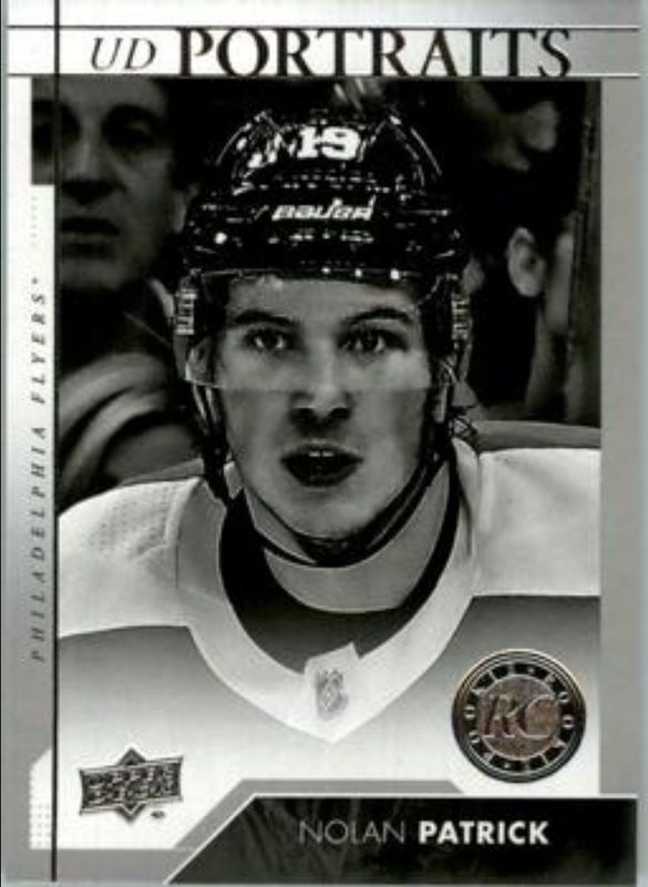 The Nolan Patrick 2017 Upper Deck #P-61 UD Portraits Rookie card is 1 of 40 Nolan Patrick's card variations in the 2017 Upper Deck set being tracked by Sports Card Investor, including Young Guns Base, Young Guns Canvas, Gold Rainbow Foil, Silver Foil, and Young Guns - Clear Cut.