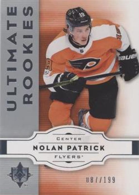 The Nolan Patrick 2017 Upper Deck Ultimate Collection #RRA-NP 2007 Retro Rookie Auto /299 card is 1 of 16 Nolan Patrick's card variations in the 2017 Upper Deck Ultimate Collection set being tracked by Sports Card Investor, including Base /99, Auto Patch /10, Shield Patch /1, Future Legacy Jersey, and Ultimate Introductions.