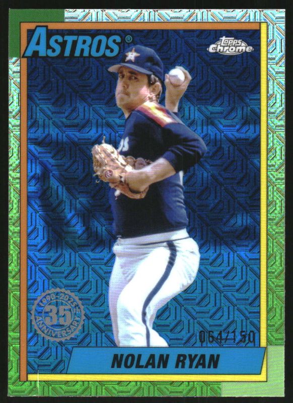The Nolan Ryan 2025 Topps #T90C-9 1990 Baseball Chrome Silver Pack - Blue Refractor /150 card is 1 of 86 Nolan Ryan's card variations in the 2025 Topps set being tracked by Sports Card Investor, including 1990 Topps Baseball, 1990 Topps Baseball - Pink, All-Star, 1990 Baseball All-Star Autographs (Series 2), and 1990 Baseball All-Star - Pink.