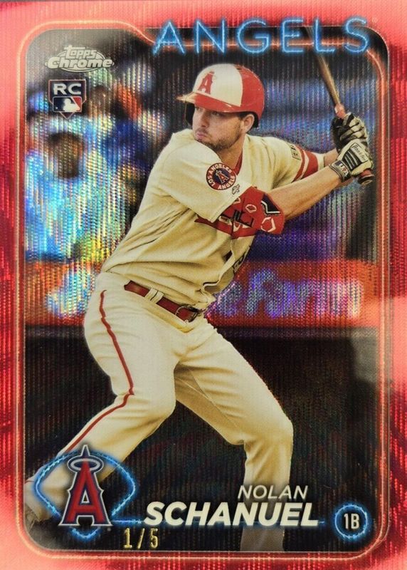 The Nolan Schanuel 2024 Topps Chrome #274 Red Wave Refractor /5 Rookie card in Raw condition has not changed in price in the last 30 days and was last sold for $157.50 .