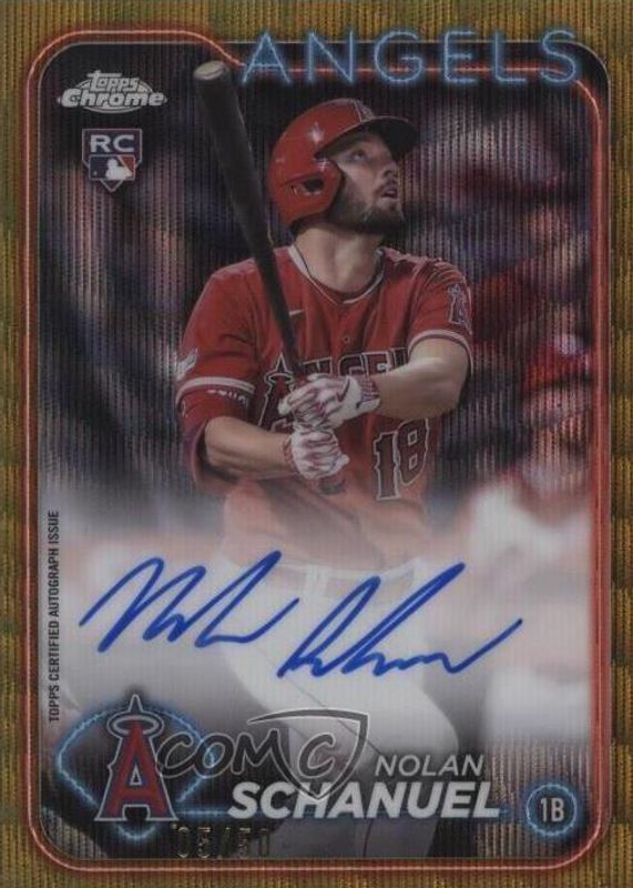The Nolan Schanuel 2024 Topps Chrome #RA-NS Rookie Autographs - Gold Wave Refractor /50 card in Raw condition has not changed in price in the last 30 days and was last sold for $75.00 .