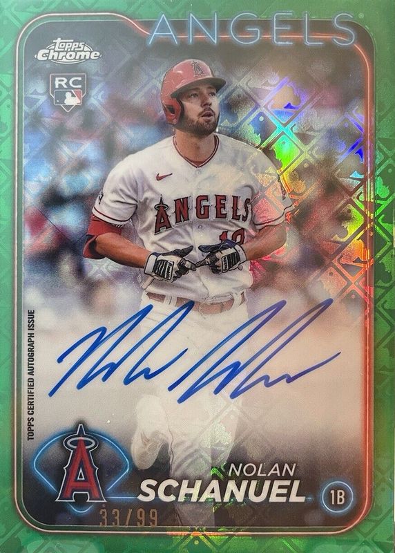 The Nolan Schanuel 2024 Topps Chrome #RA-NS Rookie Autographs - Green Refractor /99 card in Raw condition has not changed in price in the last 30 days and was last sold for $25.00 .