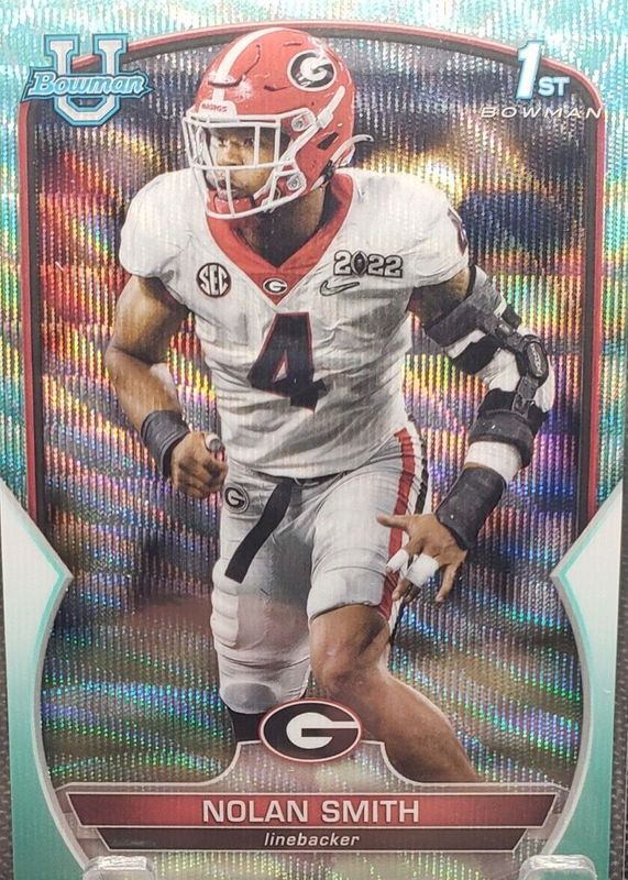 This card is 1 of 37 Nolan Smith Jr.'s card variations in the 2022 Bowman Chrome University set being tracked by Sports Card Investor, including Prospects (1st), Prospects - Pink Refractor (1st), Prospects - Purple Shimmer Refractor (1st), Prospects - Refractor (1st), and Prospects - Purple Mini-Diamond Refractor /399 (1st).