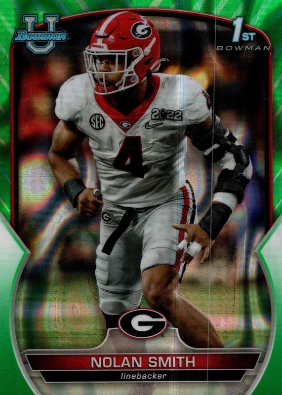 This card is 1 of 37 Nolan Smith Jr.'s card variations in the 2022 Bowman Chrome University set being tracked by Sports Card Investor, including Prospects (1st), Prospects - Pink Refractor (1st), Prospects - Purple Shimmer Refractor (1st), Prospects - Refractor (1st), and Prospects - Purple Mini-Diamond Refractor /399 (1st).