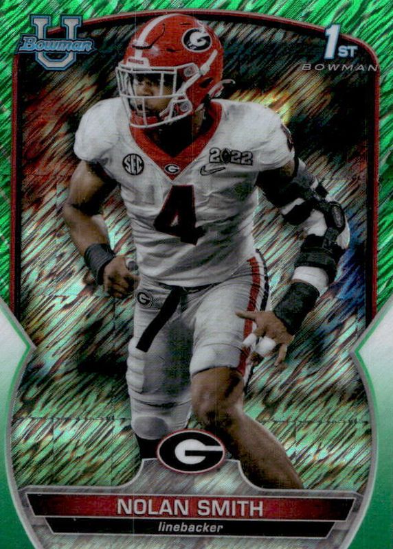 This card is 1 of 37 Nolan Smith Jr.'s card variations in the 2022 Bowman Chrome University set being tracked by Sports Card Investor, including Prospects (1st), Prospects - Pink Refractor (1st), Prospects - Purple Shimmer Refractor (1st), Prospects - Refractor (1st), and Prospects - Purple Mini-Diamond Refractor /399 (1st).