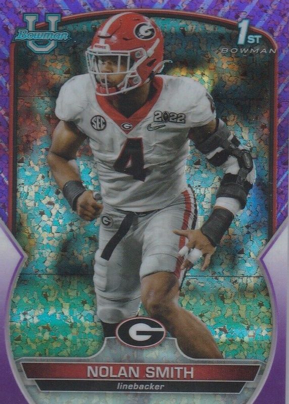 This card is 1 of 37 Nolan Smith Jr.'s card variations in the 2022 Bowman Chrome University set being tracked by Sports Card Investor, including Prospects (1st), Prospects - Pink Refractor (1st), Prospects - Purple Shimmer Refractor (1st), Prospects - Refractor (1st), and Prospects - Purple Refractor /399 (1st).