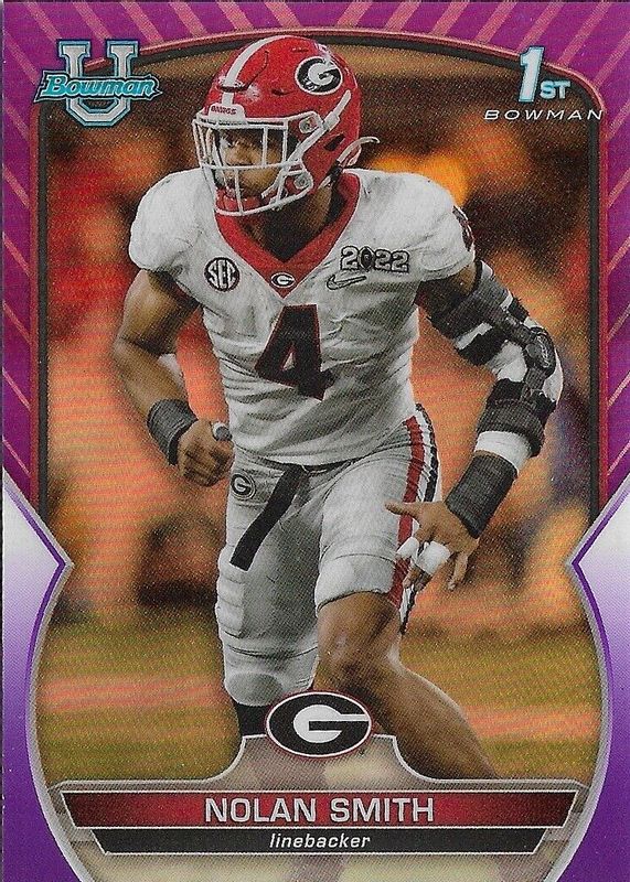 This card is 1 of 37 Nolan Smith Jr.'s card variations in the 2022 Bowman Chrome University set being tracked by Sports Card Investor, including Prospects (1st), Prospects - Pink Refractor (1st), Prospects - Purple Shimmer Refractor (1st), Prospects - Refractor (1st), and Prospects - Purple Mini-Diamond Refractor /399 (1st).