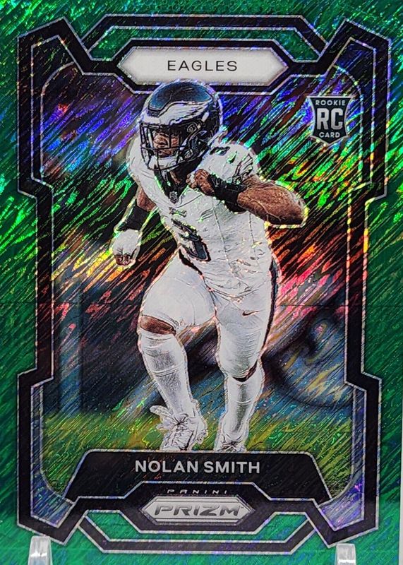 The Nolan Smith Jr. 2023 Prizm #382 Green Shimmer /5 Rookie card in Raw condition has not changed in price in the last 30 days and was last sold for $145.00 .