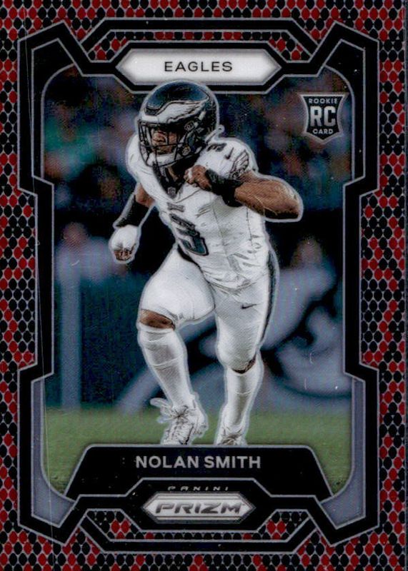The Nolan Smith Jr. 2023 Prizm #382 Snakeskin /(SSP) Rookie card in Raw condition has not changed in price in the last 30 days and was last sold for $69.99 .