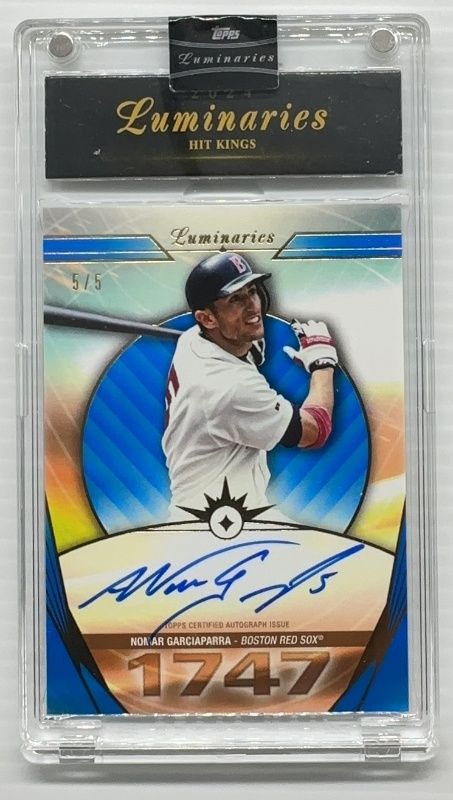 The Nomar Garciaparra 2024 Topps Luminaries #HK-NG Hit Kings Autographs - Blue /5 card is 1 of 9 Nomar Garciaparra's card variations in the 2024 Topps Luminaries set being tracked by Sports Card Investor, including Hit Kings Autographs /25, Hit Kings Autographs Relics /15, Hit Kings Autographs - Red /10, Hit Kings Autographs Relics - Blue /10, and Hit Kings Autographs - Purple /3.
