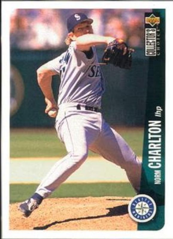 The Norm Charlton 1996 Upper Deck Collector's Choice #726 Base card is 1 of 3 Norm Charlton's card variations in the 1996 Upper Deck Collector's Choice set being tracked by Sports Card Investor, including Gold Signatures, and Silver Signatures.