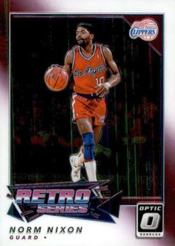 The Norm Nixon 2017 Optic #8 Retro Series card is 1 of 9 Norm Nixon's card variations in the 2017 Optic set being tracked by Sports Card Investor, including Retro Series - Fast Break, Retro Series - Holo, Retro Series - Lime Green /175, Retro Series - Red /99, and Retro Series - Blue /49.