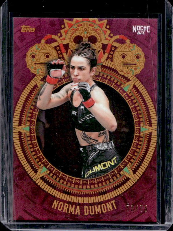The Norma Dumont 2024 Topps Noche UFC #10 Pink /75 card is 1 of 14 Norma Dumont's card variations in the 2024 Topps Noche UFC set being tracked by Sports Card Investor, including Base, Die-Cut, Silver /125, Green /99, and Blue /49.