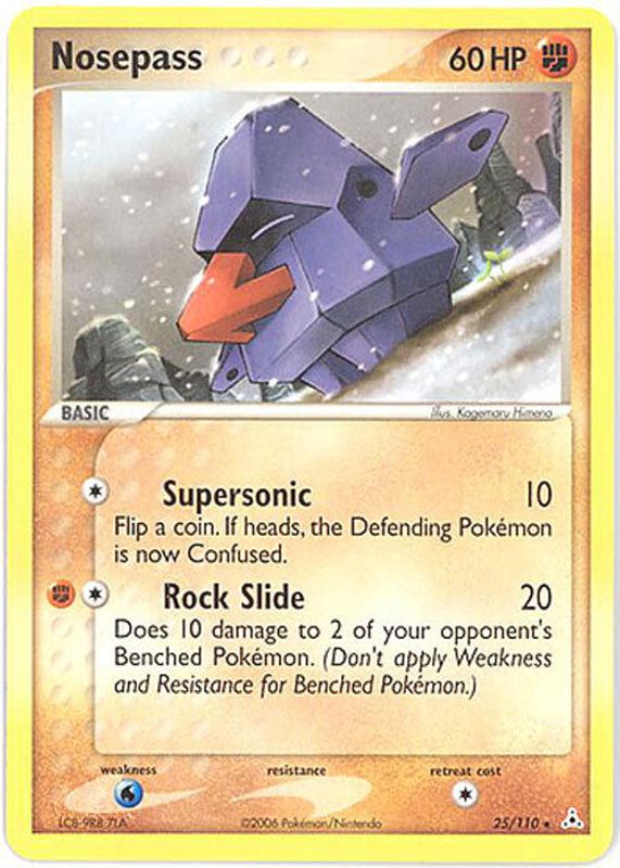 The Nosepass 2006 EX: Holon Phantoms #025/110 Base card in Raw TCG (Near Mint) condition has not changed in price in the last 30 days and was last sold for $3.00 .