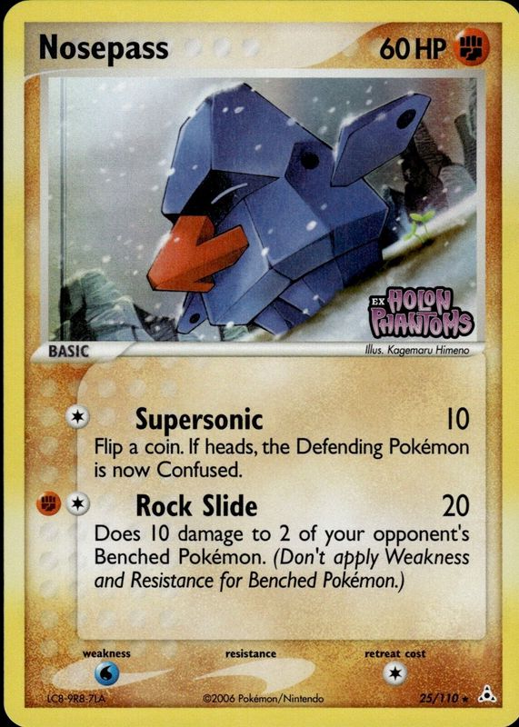 The Nosepass 2006 EX: Holon Phantoms #025/110 Reverse Holo card in Raw TCG (Near Mint) condition has moved up $12.49 (+167%) in the last 30 days and was last sold for $19.99 .