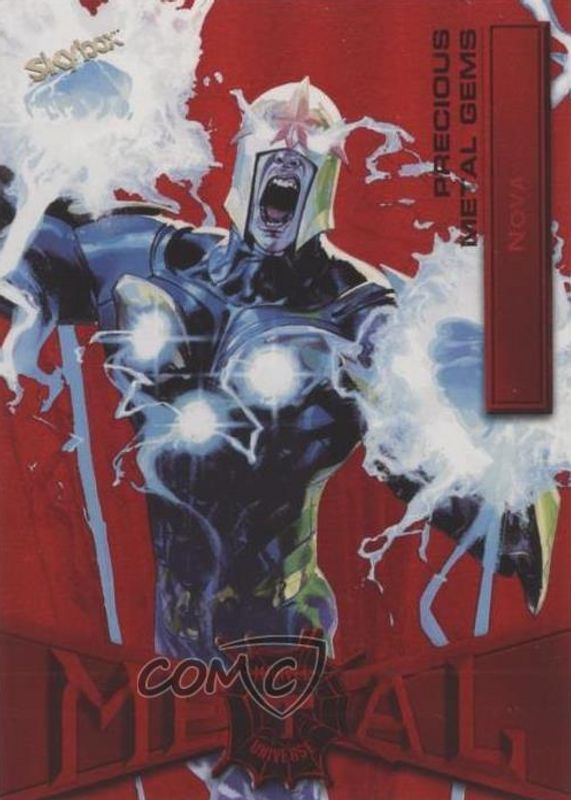This card is 1 of 4 Nova's card variations in the 2021 Skybox Marvel Metal Universe Spider-Man set being tracked by Sports Card Investor, including Precious Metal Gems Red (High Series) /90, Precious Metal Gems Green /10, and Precious Metal Gems Green (High Series) /10.