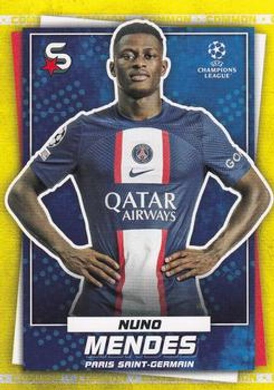 The Nuno Mendes 2022 Topps UEFA Superstars #129 Common Yellow card is 1 of 22 Nuno Mendes' card variations in the 2022 Topps UEFA Superstars set being tracked by Sports Card Investor, including Base, Common Yellow, Fire & Ice Limited, Molten Rare, and Mystic.