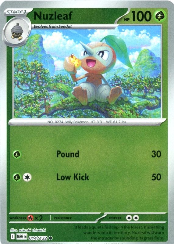 The Nuzleaf 2025 Mega Evolution #014/132 Reverse Holo card in Raw TCG (Lightly Played) condition has not changed in price in the last 30 days and was last sold for $2.25 .