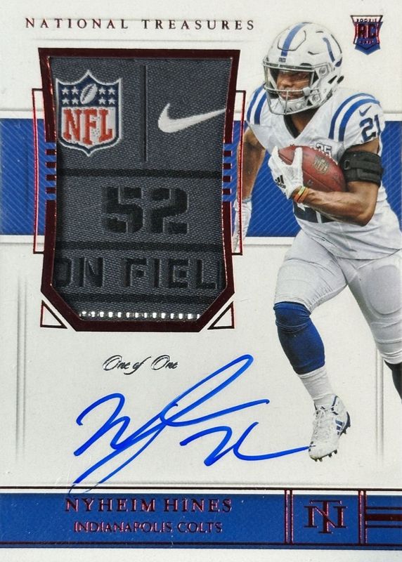 This card is 1 of 12 Nyheim Hines' card variations in the 2018 National Treasures set being tracked by Sports Card Investor, including Rookie Patch Auto /99, Rookie Patch Auto - Green Jersey Number (/21), Rookie Patch Auto - Holo Silver /25, Rookie Patch Auto - Midnight /20, and Rookie Patch Auto - Stars & Stripes /15.