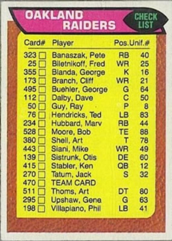 The Oakland Raiders 1976 Topps #470 Base card is 1 of 2 Oakland Raiders' card variations in the 1976 Topps set being tracked by Sports Card Investor, including Team Checklist.