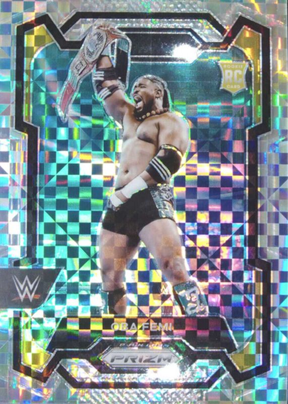 The Oba Femi 2024 Prizm WWE #199 Lucky Envelopes /8 Rookie card in Raw condition has not changed in price in the last 30 days and was last sold for $127.50 .
