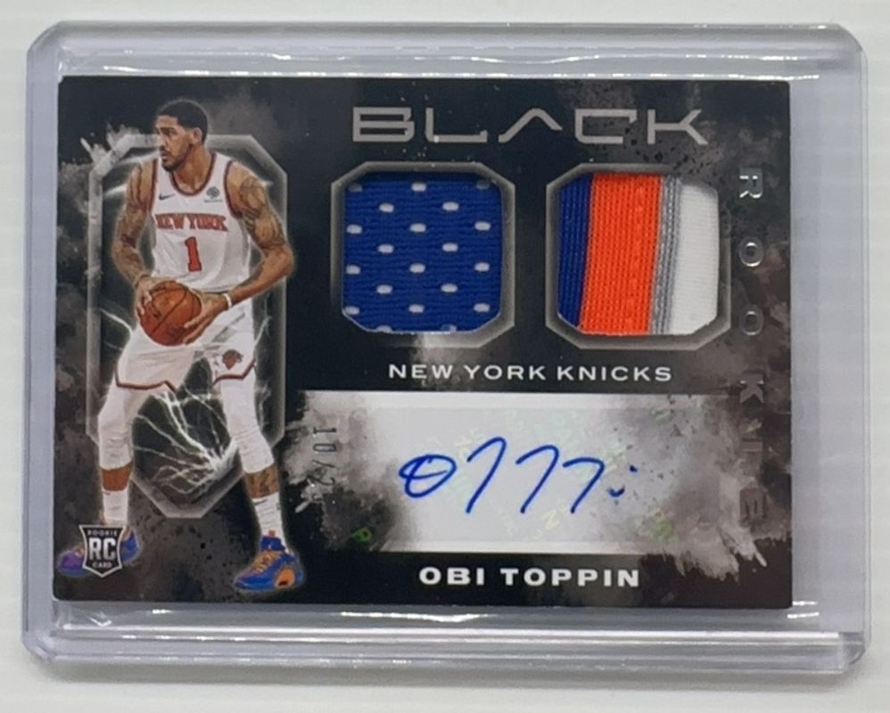 The Obi Toppin 2020 Black #RMA-OBI Rookie Memorabilia Autographs - Silver /25 card is 1 of 24 Obi Toppin's card variations in the 2020 Black set being tracked by Sports Card Investor, including Base /149, Swirlorama /65, Rainbow Spokes /49, Diamond Awe /25, and Small Hyperplaid /5.