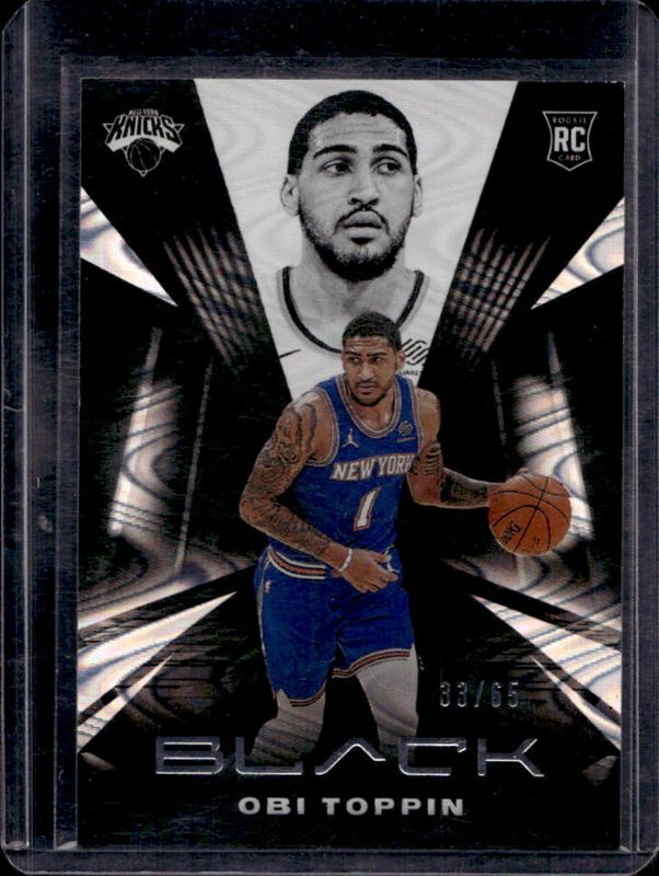 The Obi Toppin 2020 Black #91 Swirlorama /65 Rookie card is 1 of 24 Obi Toppin's card variations in the 2020 Black set being tracked by Sports Card Investor, including Base /149, Rainbow Spokes /49, Diamond Awe /25, Small Hyperplaid /5, and Fractal /1.