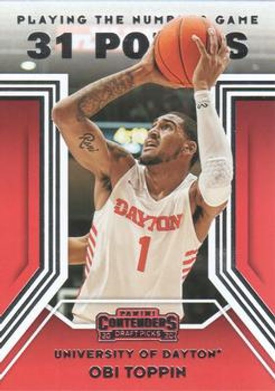 The Obi Toppin 2020 Contenders Draft Picks #5 Playing the Numbers Game Rookie card is 1 of 92 Obi Toppin's card variations in the 2020 Contenders Draft Picks set being tracked by Sports Card Investor, including #52d Base, #52f Base, #52e Base, #52 Base, and #52b Base.