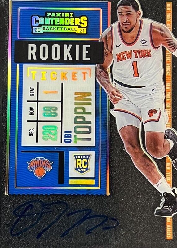 The Obi Toppin 2020 Contenders #127 Rookie Ticket Auto - Clear Ticket (No Ball) card in Raw condition has not changed in price in the last 30 days and was last sold for $7.00 .