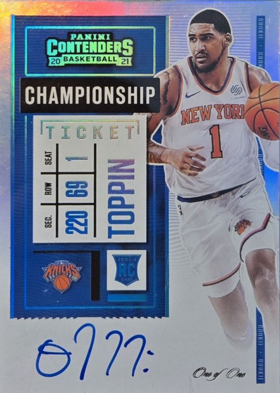 The Obi Toppin 2020 Contenders #127 Rookie Ticket Auto Variation - Championship Ticket /1 (Ball in Left Hand) card in Raw condition has not changed in price in the last 30 days and was last sold for $500.00 .