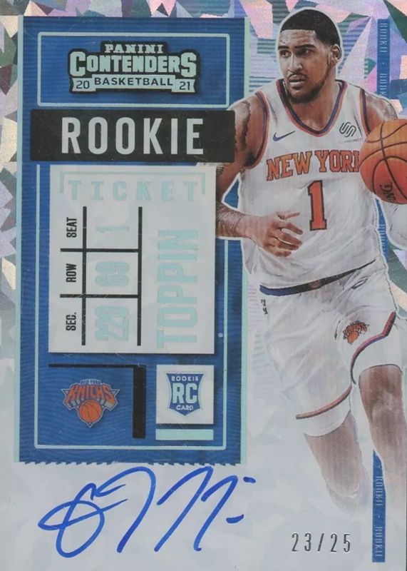 The Obi Toppin 2020 Contenders #127 Rookie Ticket Auto Variation - Cracked Ice Ticket /25 (Ball in Left Hand) card in Raw condition has not changed in price in the last 30 days and was last sold for $197.50 .