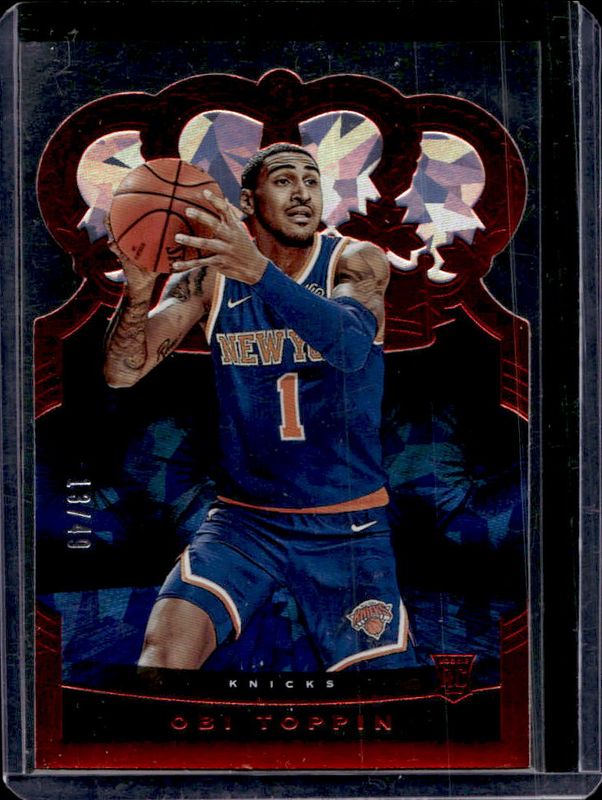 The Obi Toppin 2020 Crown Royale #92 Crystal Red /49 Rookie card is 1 of 40 Obi Toppin's card variations in the 2020 Crown Royale set being tracked by Sports Card Investor, including #127 Base, #92 Base, #92 Asia Gold, #92 Asia Red, and #92 Crystal.