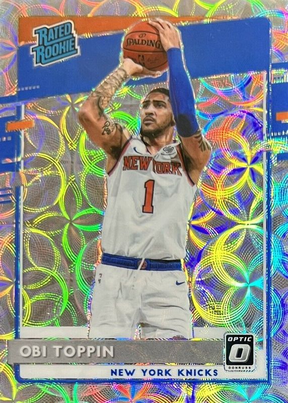 This card is 1 of 84 Obi Toppin's card variations in the 2020 Optic set being tracked by Sports Card Investor, including Base, Blue Pulsar, Blue Velocity, Checkerboard, and Choice.
